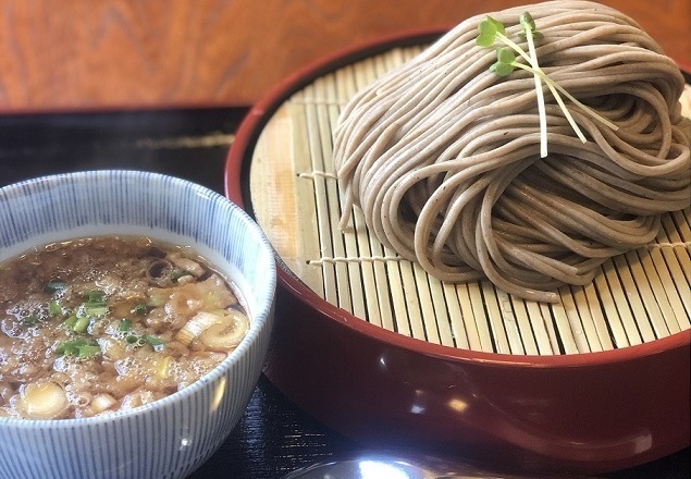 温かい豚肩側のみ使用の豚バラ入りの肉汁に蕎麦をつけて食べる食べ応えのある一品。